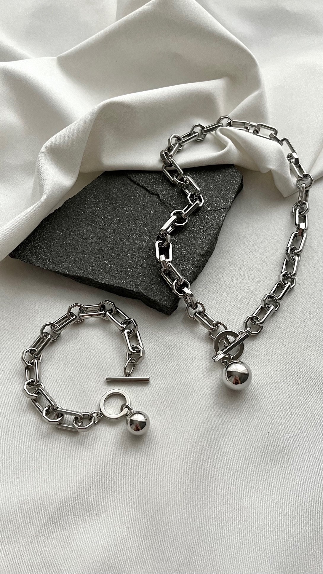 This refined fashion set includes a necklace and matching bracelet, crafted from steel with a rhodium-plated finish for a sleek, contemporary look and lasting brilliance.