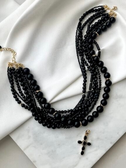 This elegant necklace is composed of five finely arranged pearl strands, featuring a balanced mix of small and medium-sized pearls. The refined composition creates a soft, harmonious look, enhanced by a silver-tone clasp that adds a subtle touch of luxury. (silver-tone Cross pendant)